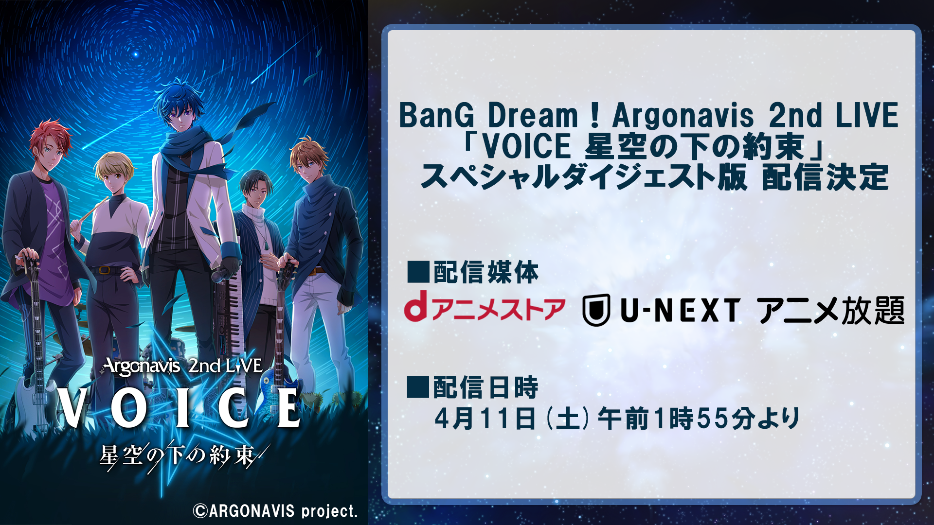 動画配信サービスにて『BanG Dream!Argonavis 2nd LIVE「VOICE 星空の下の約束」』スペシャルダイジェスト版の配信が決定しました。